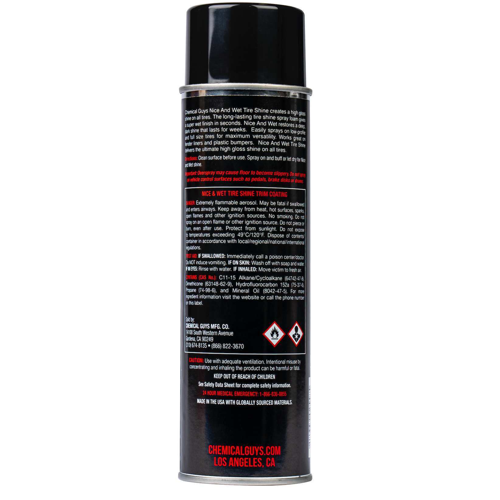Nice and Wet is a foaming aerosol spray dressing that protects and restores rubber tires and trim pieces. leaving behind a super wet shine for that perfect showroom floor look. Just spray it on and allow it to dry for instant. easy shine.